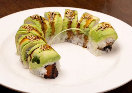 Shrimp tempura, masago, avocado, cucumber, and sprouts rolled in tempura crumbs, drizzled with sweet eel sauce. .