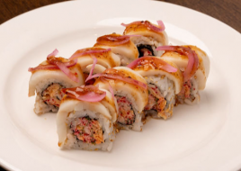 TOP: tuna, yellowtail, avocado, lemon zest, chili ponzu sauce, and green onions..